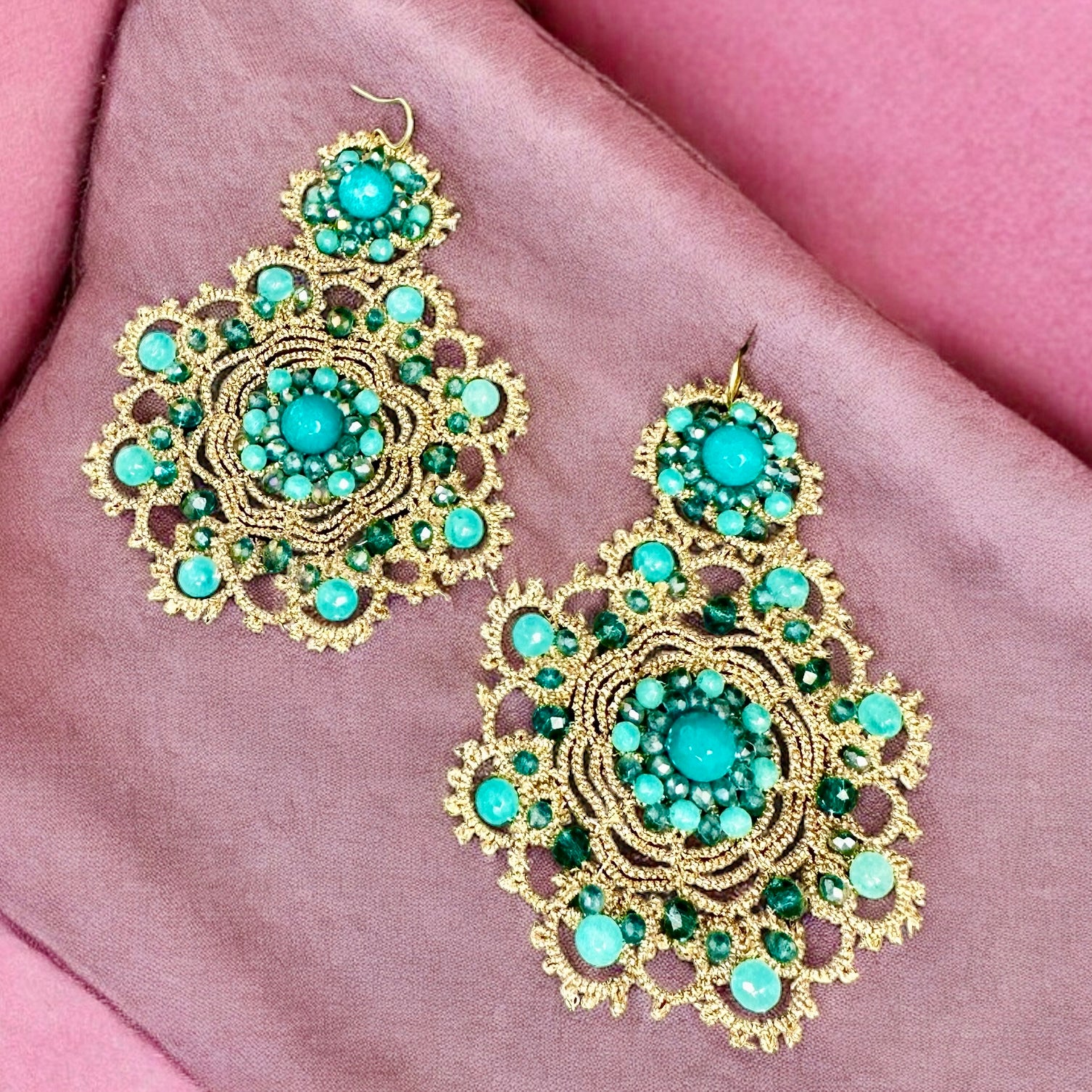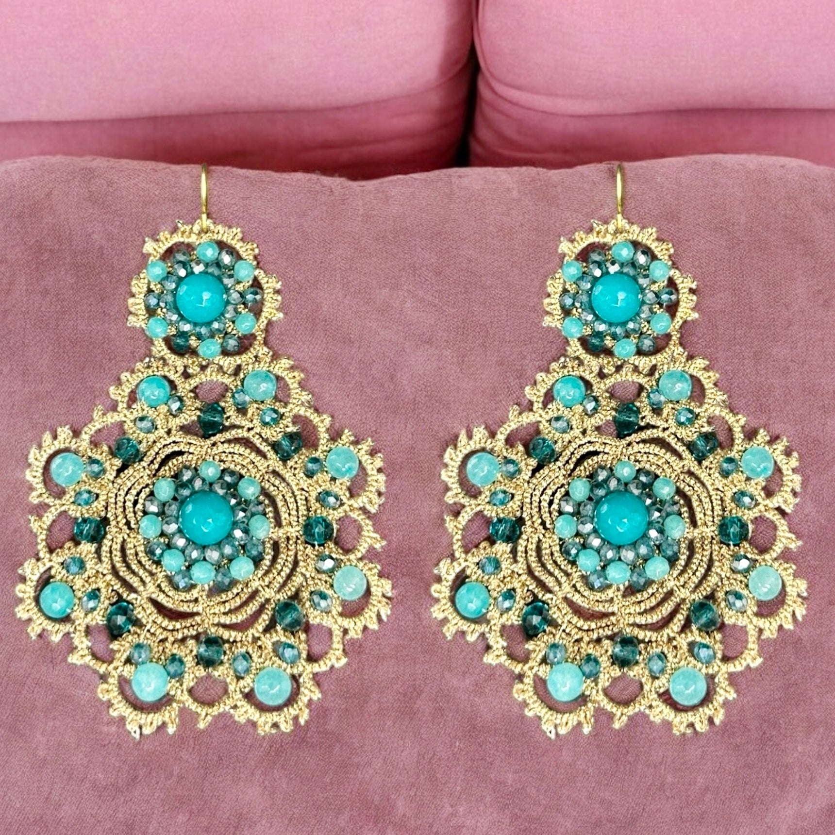 • Handgefertigte Ohrringe aus Platin-Gold-Okked-Spitze, Quarz und Kristallen, Silberstifte