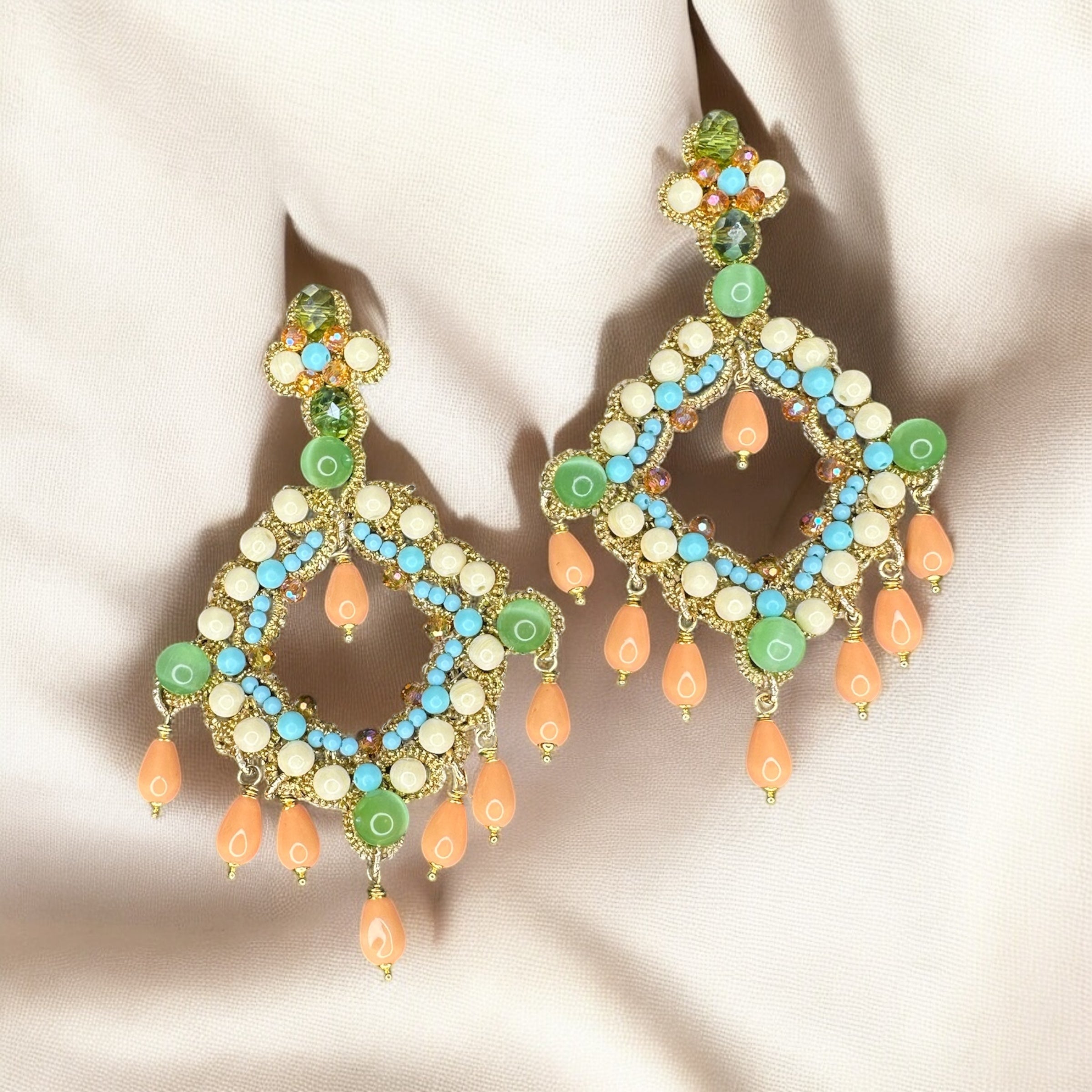 - Orecchini realizzati a mano in pizzo chiacchierino colore oro laminato, pasta di turchese, occhio di gatto, conchiglia, osso e cristalli, perni in acciaio nichel free